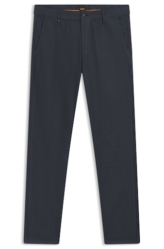 Deze donkerblauwe chino van BOSS is gemaakt van stretchkatoen en heeft een tapered fit. De broek is afgewerkt met een ritssluiting met knoop, 2 steekzakken voor en is voorzien van 2 paspelzakken op de achterkant. Er is wat stretch toegevoegd voor het draagcomfort.
