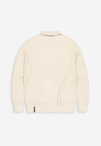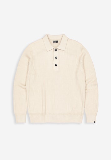 Deze off/white gebreide trui van BUTCHER OF BLUE is gemaakt van katoen en heeft een normale pasvorm. De trui is afgewerkt met een polokraag met 3-knoopsluiting, afsluitband op de mouw en onderkant en is voorzien van een stoffen logo op de mouw. Leuk detail; Het shirt is voorzien van een ribmotief.
