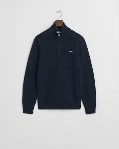 Deze donkerblauwe trui van GANT is gemaakt van katoen en heeft een regular fit. De trui is afgewerkt met een geribd opstaand boord met korte rits, afsluitband op de mouw en onderkant en is voorzien van een GANT schild op de borst. Dit model is in 2 kleuren verkrijgbaar.