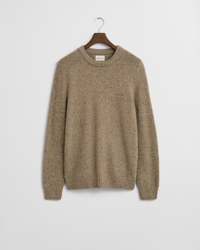 Deze taupe/zandkleurige trui is gemaakt van een wolmix en heeft een regular fit. De trui is afgewerkt met een rond geribd boord, afsluitband op de mouw en onderkant en is voorzien van een geborduurd logo op de borst. Leuk detail; De all-over spikkelpatroon op de trui.