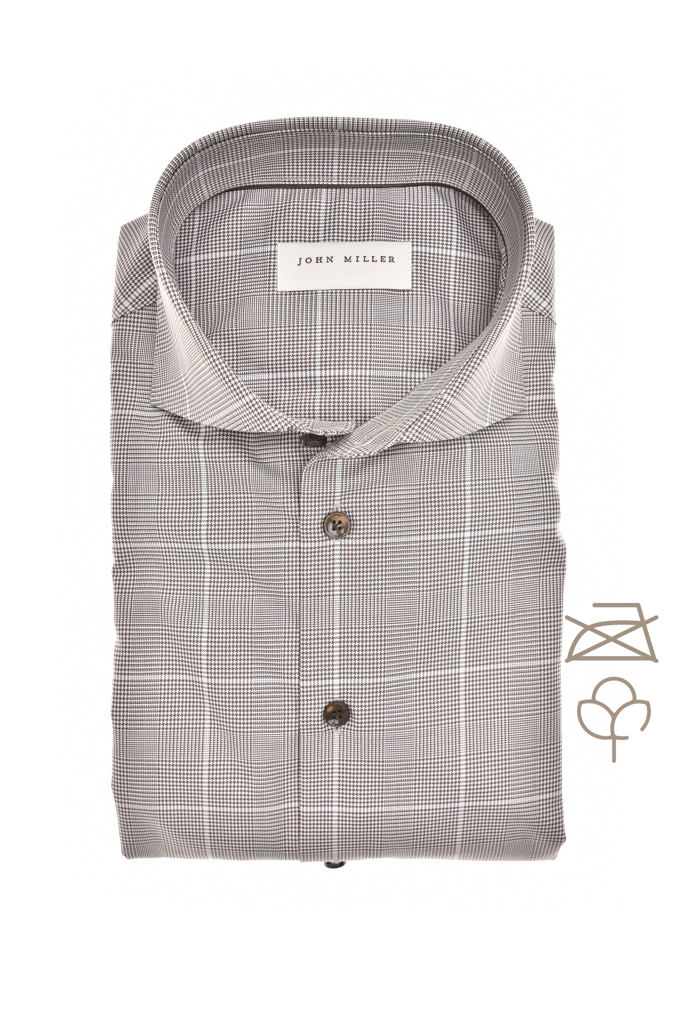 Dit donkerbruine overhemd van JOHN MILLER is gemaakt van strijkvrij katoen en heeft een tailored fit. Het shirt is afgewerkt met een gekleurde knoop, wide spread boord, licht afgeronde zoom aan de onderkant en is voorzien van een geborduurd logo op het manchet. Leuk detail; de all-over ruitprint op het shirt. Dit model is in 2 kleuren verkrijgbaar.