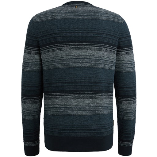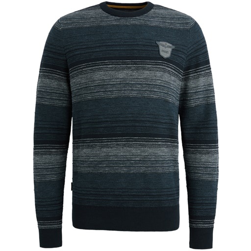 Deze blauwkleurige gebreide trui van PME LEGEND is gemaakt van mêlee katoen en heeft een regular fit. De trui is afgewerkt met een rond geribd boord, afsluitband op de mouw en onderkant en is voorzien van een logopatch op de borst.