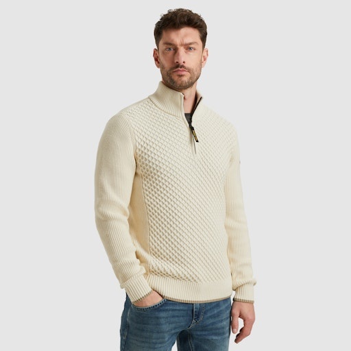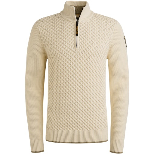 Deze off-white gekleurde trui van PME LEGEND is gemaakt van een katoenmix en heeft een regular fit. De trui is afgewerkt met een geribd opstaand boord, korte ritssluiting, afsluitband op de mouw en onderkant met kleurdetail , logobadge op de mouw en is voorzien van een all-over grove structuur. Dit model is in 2 kleuren verkrijgbaar.