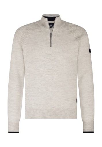 Deze lichtbeige gebreide trui van STATE OF ART is gemaakt van een mêlee katoenmix en heeft een regular fit. De trui is afgewerkt met een geribd boord met korte rits, afsluitband op de mouw en onderkant en is voorzien van een raglan mouw.