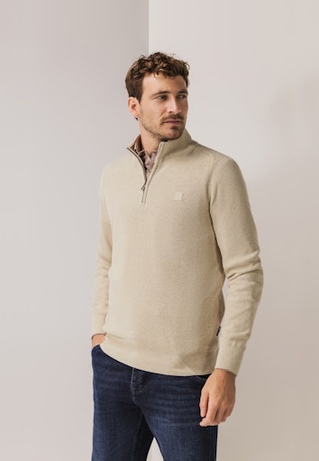 Deze zandkleurige trui van STATE OF ART is gemaakt van katoen en heeft een regular fit. De trui is afgewerkt met een opstaand boord, korte rits, afsluitband op de mouw en onderkant en is voorzien van een rubberen badge op de mouw. Leuk detail; het ribpatroon op de mouw.
